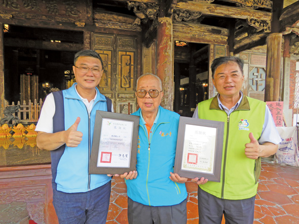 ▲鎮長許志宏、鄉長蔣煙燈贈感謝狀,感謝鹿港龍山寺善行。