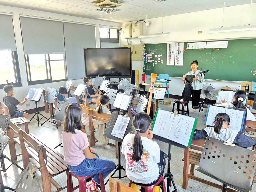 施瑞樓表示,王功國小南管戲曲班已來到第八堂課,除了複習舊曲目,老師還特別教大家琵琶的彈奏技巧——在彈奏時瞬間壓著弦,讓聲音變得短促俐落,整體更自然、更有意境。課堂中,老師也分享了〈走馬〉的意象:「下工 下工 下工工下工」,以這句節奏為基礎,帶領同學們打下吹、拉、彈、唱的紮實基本功夫。還加入了「十六蹲」的小遊戲,讓大家在笑聲中加深印象、學習得更加熟練。