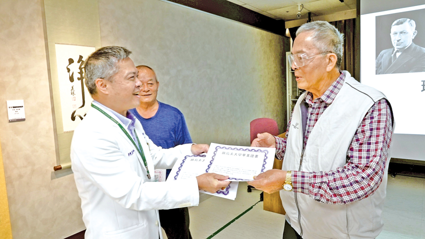 ▲彰濱秀傳班廷俱樂部主任蕭立偉在世界糖尿病日頒發畢業證書給糖友們。
