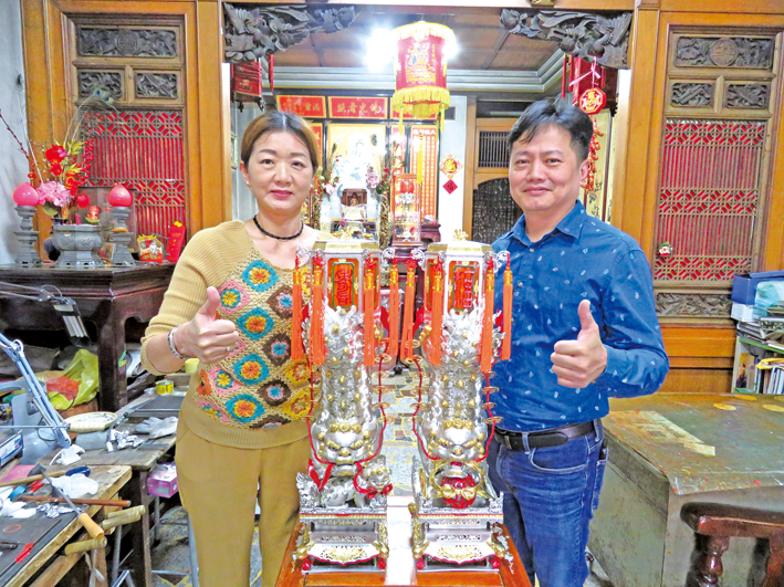 ▲陳志昇創作「賜財燈」,左為夫人陳麗朱。