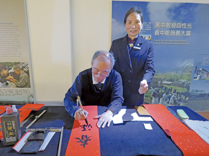日前,彰化慈濟人於秀水靜思堂舉辦「莫忘竹筒歲月初心、永誌法脈宗門弘願」歲末祝福與歲末圍爐迎新春活動,書法家慈濟師兄王添進均於現場進行春聯揮毫,作品深受民眾喜愛前來索取。