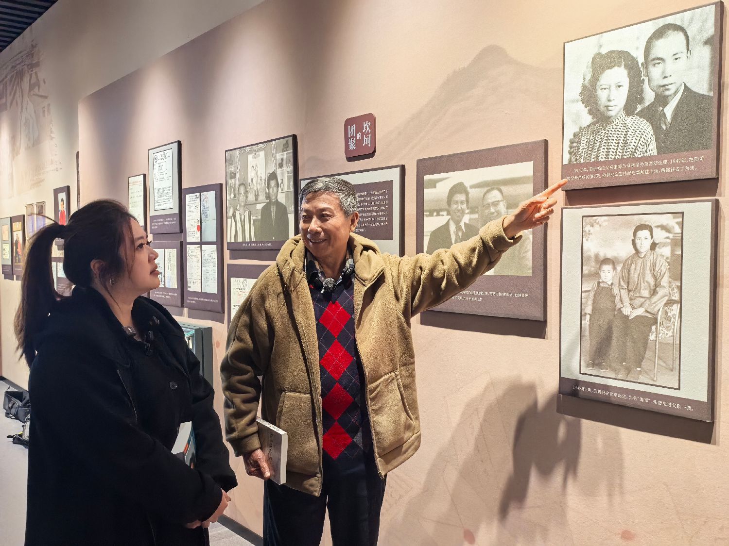 圖:「兩岸信差」田圻暢(右)在中國閩台緣博物館講述自己的經歷與兩岸尋親故事。 (圖片來源:中新社)