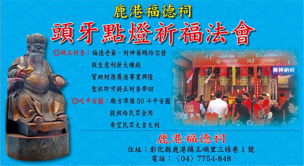 鹿港福德祠頭牙點燈祈福法會 財源廣進賜正財香暨大吉大利吃平安圓