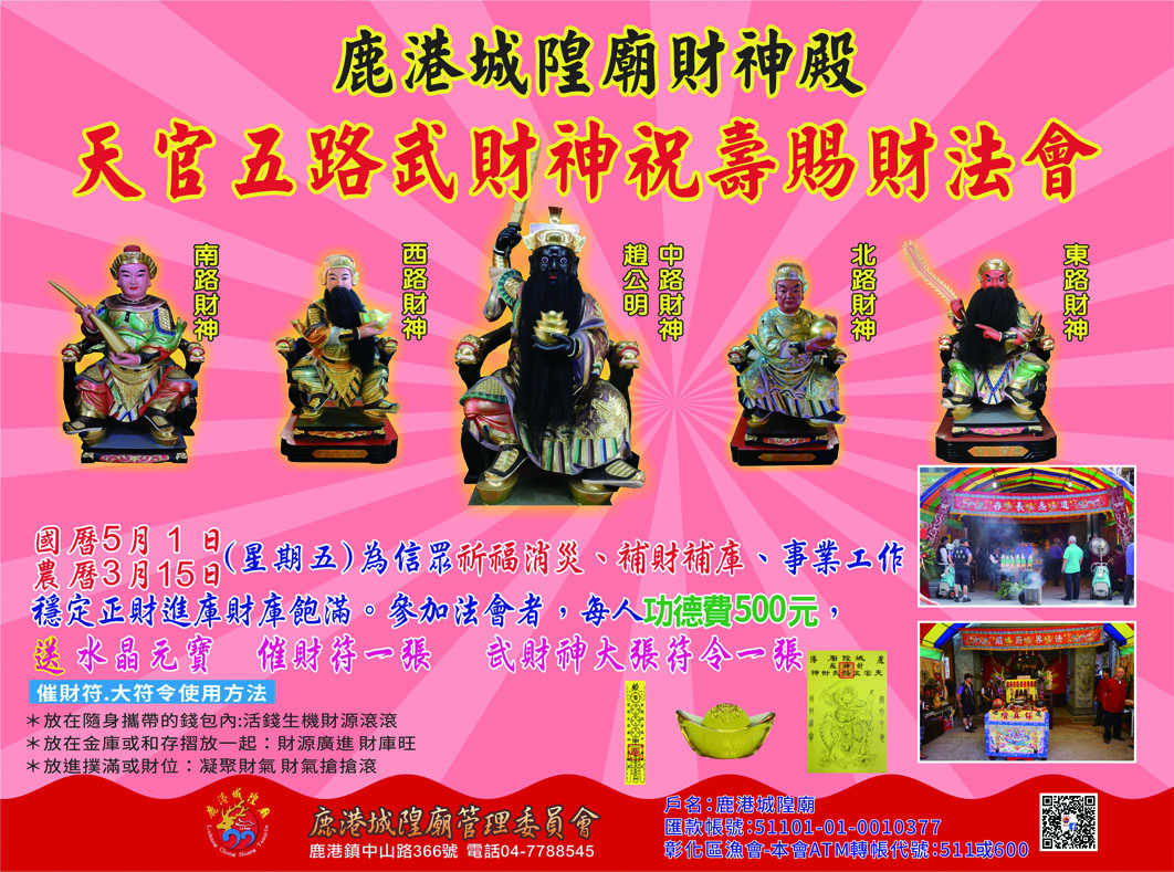 鹿港城隍廟財神殿天官五路武財神祝壽賜財法會